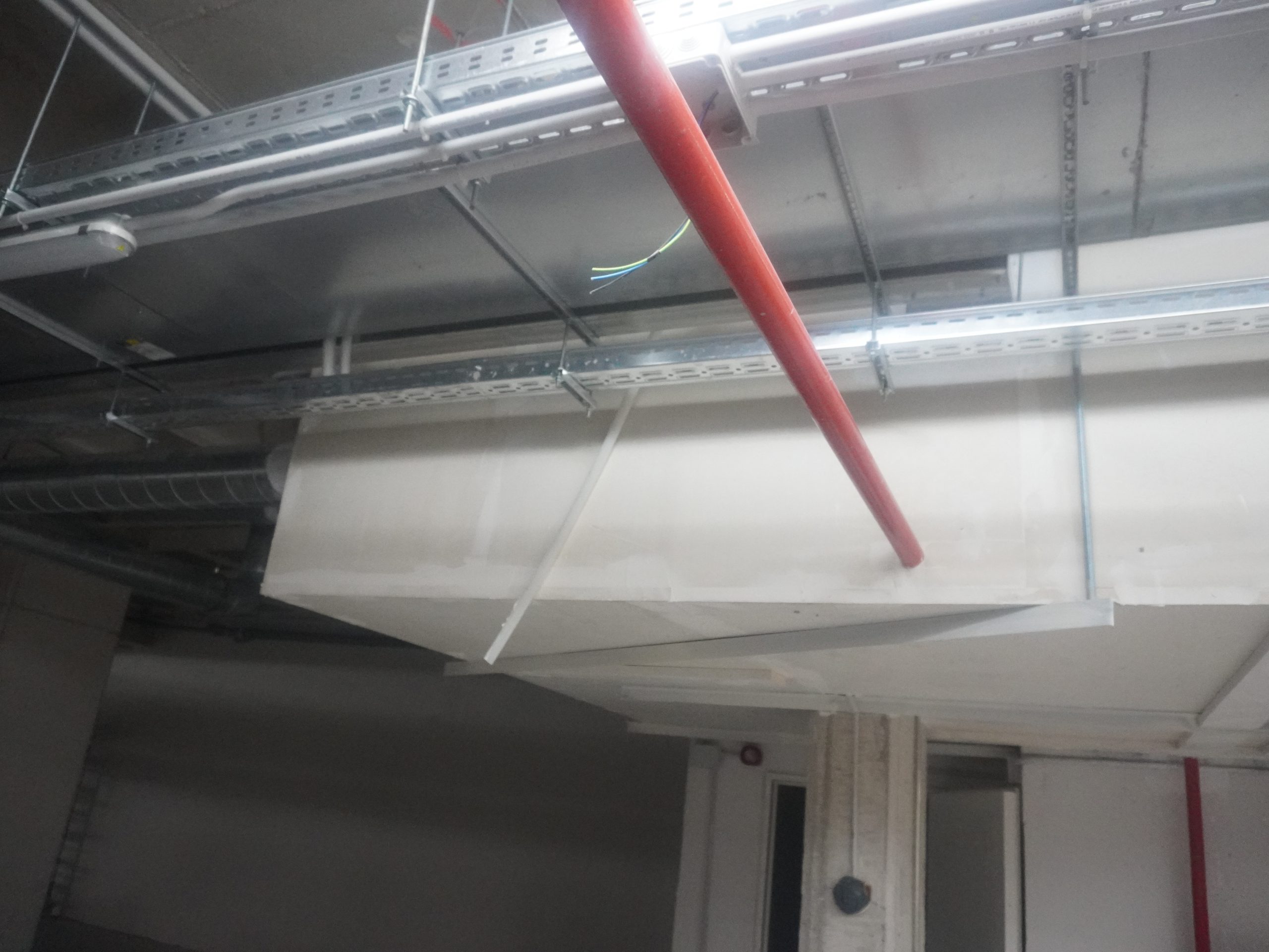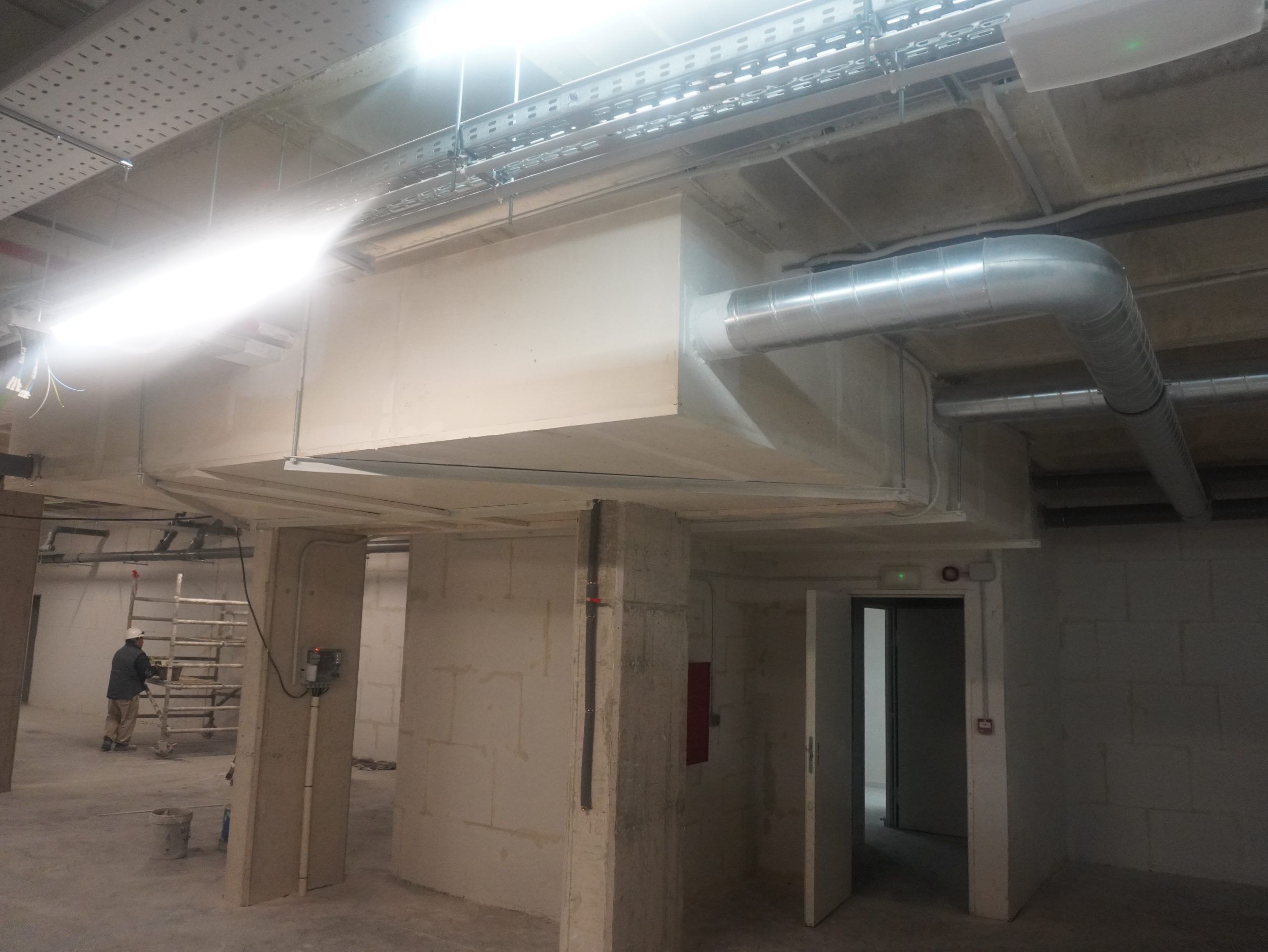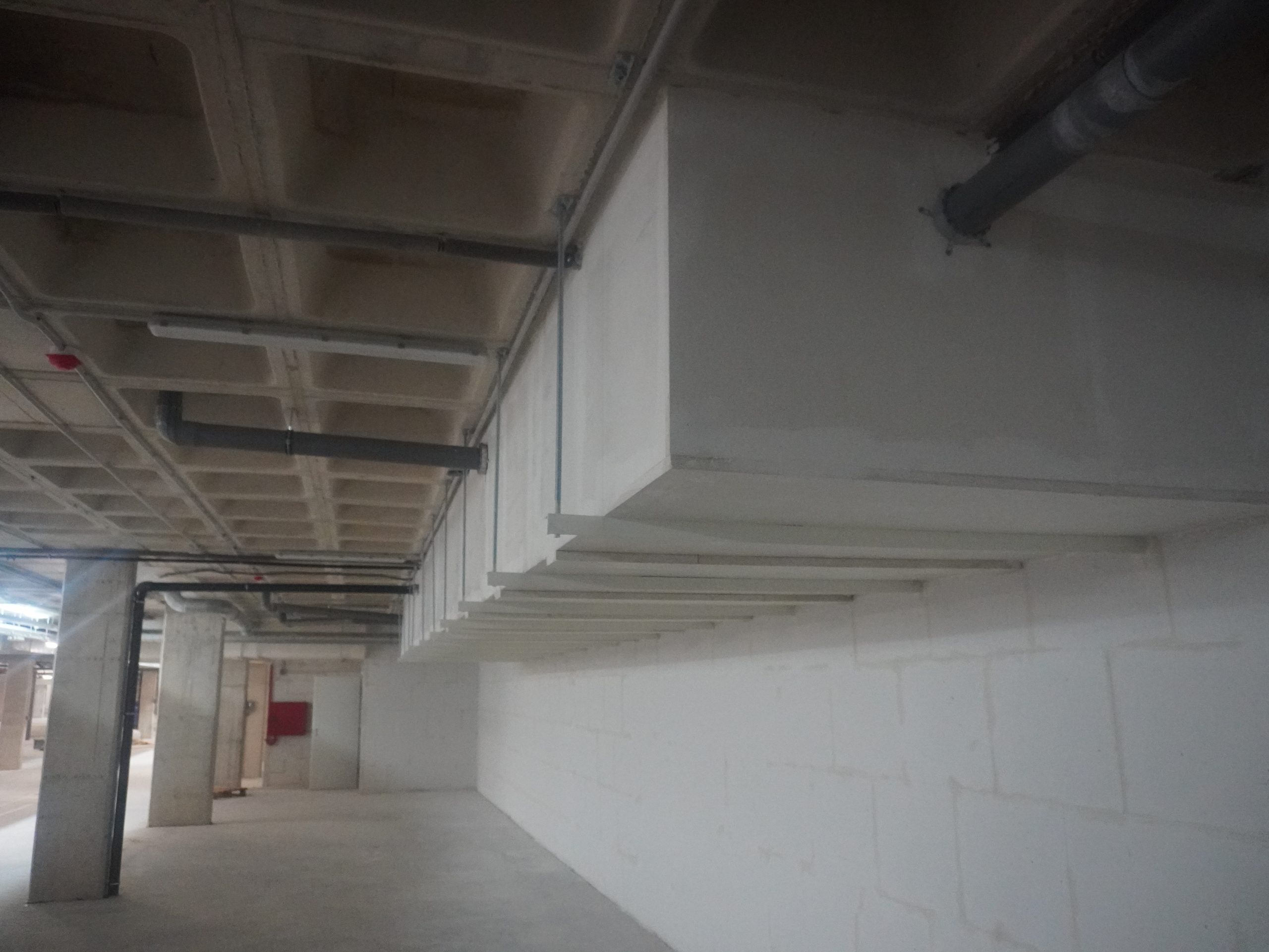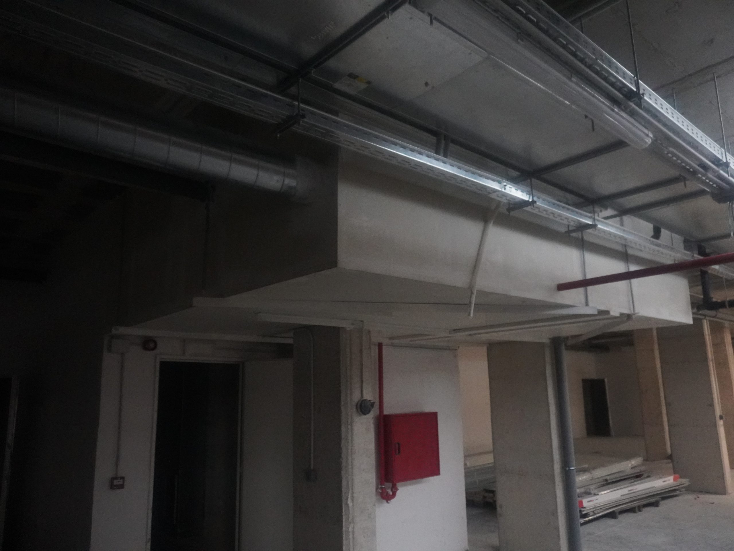 Para reforzar la protección del sistema de ventilación, se ha instalado un conducto de ventilación de placa de fibrosilicato EI120, una solución clave para evitar la propagación del fuego y el humo a través de las instalaciones. Este material ofrece una resistencia de hasta 120 minutos, asegurando la estabilidad estructural del conducto en caso de incendio y facilitando la evacuación segura del edificio.